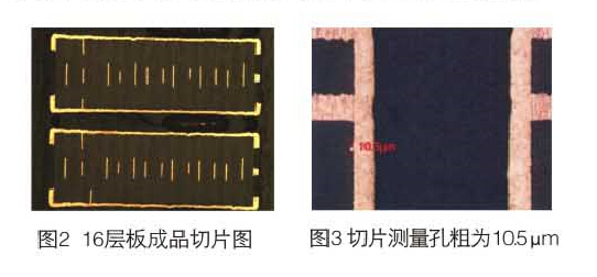 由于各層疊加導致板件和銅層超厚,對鉆頭磨損嚴重,容易折斷鉆刀,對于孔數、落速和轉速適當的下調。精確測量板的漲縮,提供精確的系數;層數≥14層、孔徑≤0.2mm或孔到線(xiàn)距離≤0.175mm,采用孔位精度≤0.025mm 的鉆機生產(chǎn);直徑φ4.0mm以上孔徑采用分步鉆孔,厚徑比12:1采用分步鉆,正反鉆孔方法生產(chǎn);控制鉆孔披鋒及孔粗,高層板盡量采用全新鉆刀或磨1鉆刀鉆孔,孔粗控制25um以?xún)?。為改善高層厚銅板的鉆孔毛刺問(wèn)題,經(jīng)批量驗證,使用高密度墊板,疊板數量為一塊,鉆頭磨次控制在3次以?xún)?,可有效改善鉆孔毛刺,如圖2、圖3所示。