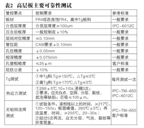 高層板一般為系統板,比常規多層板厚、更重、單元尺寸更大,相應的熱容也較大,在焊接時(shí),需要的熱量更多,所經(jīng)歷的焊接高溫時(shí)間要長(cháng)。在217℃(錫銀銅焊料熔點(diǎn))需50秒至90秒,同時(shí)高層板冷卻速度相對慢,因此過(guò)回流焊測試的時(shí)間延長(cháng),并結合IPC-6012C、 IPC-TM-650標準以及行業(yè)要求,對高層板的主要可靠性測試,如表2所述。