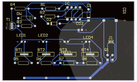 本電路中全部元件采用插孔封裝形式。除了電池組正極性的封裝,其他元器件封裝均采用Protel 2004元器件庫中的標準封裝,我們需要根據實(shí)際電路為電池組的正極性端設置出封裝,首先創(chuàng )建自己的元器件封裝庫,在庫里創(chuàng )建如圖2中BT1-BT4所示封裝,然后將此封裝設置為電池組的封裝即可。