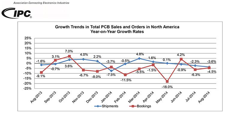 2014年8月份,北美PCB行業(yè)總出貨量,同比下降3.6%,把年初至今的出貨量增長(cháng)率推低到-0.9%。與上月相比,PCB總出貨量環(huán)比上升了4.9個(gè)百分點(diǎn)。