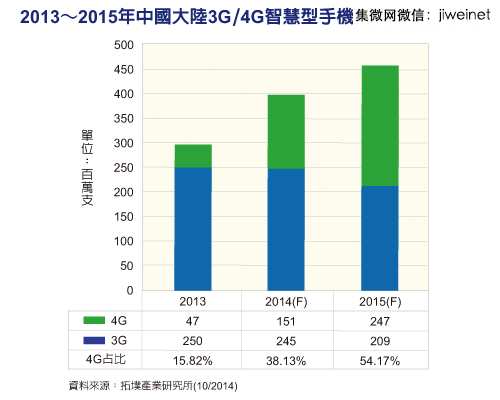 市場(chǎng)研究機構拓墣產(chǎn)業(yè)研究所指出,隨著(zhù)4G服務(wù)開(kāi)通與4G晶片價(jià)格快速下滑,中大陸市場(chǎng)4G手機出貨量正強勁增長(cháng),預估2014年可達一億五千一百萬(wàn)支;2015年更將正式超越3G手機出貨量,達到二億四千七百萬(wàn)支規模,并占整體中智慧手機出貨量54.17%。