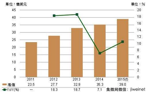 雖自2011年以來(lái),全球智慧型手機出貨量年成長(cháng)率即呈現逐年下滑態(tài)勢,但2015年預估仍能維持2位數年成長(cháng)幅度,加上來(lái)自大陸IC內需市場(chǎng)規模亦持續成長(cháng),使得同期大陸IC設計業(yè)產(chǎn)值仍將能維持20%以上的成長(cháng)動(dòng)能。在大陸IC設計產(chǎn)業(yè)強勁成長(cháng)帶動(dòng)下,DIGITIMESResearch預估,2015年大陸晶圓代工產(chǎn)業(yè)產(chǎn)值將達39億美元,較2014年成長(cháng)10.5%。