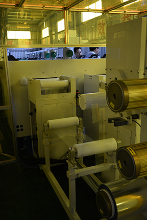 在閆董的帶領(lǐng)陪同下,GPCA/SPCA一行參觀(guān)了巨龍自主研發(fā)制造的RTR/DES生產(chǎn)線(xiàn)。據介紹,RTR/DES生產(chǎn)線(xiàn)的大特點(diǎn)在于卷對卷、水平雙工位作業(yè),該DES線(xiàn)的過(guò)板能力薄0.036mm,板寬度為250mm,同時(shí)能生產(chǎn)兩種不同規格的產(chǎn)品,大大提升了生產(chǎn)效率;同時(shí),此DES線(xiàn)還配置了真空蝕刻工藝,有效防止“水池效應”、提高蝕刻均勻性,目前在片對片實(shí)驗中極差值已達到了94%以上,量產(chǎn)可達到40um/40um。該DES線(xiàn)不僅節省了勞動(dòng)成本、提高了整體的生產(chǎn)效率,還有效保證軟板的品質(zhì),使軟板生產(chǎn)技術(shù)更上一個(gè)臺階。