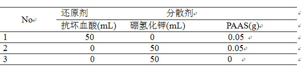 將相同量0.8 gAgNO3 分別溶于少量的水中,加入100 ml的去離子水,充分攪拌使其溶解,分別用不同的還原劑和分散劑:還原劑為抗壞血酸和硼氫化鉀,其濃度均為1.0×10-3 mol/L,分散劑為PAAS,加入不同的量,見(jiàn)表一。然后攪拌使其均勻分散于溶劑中,在常溫下反應3 h,然后將所得到的懸濁液以10000 r/min的轉速離心分離10 min,后將所得的產(chǎn)品于65℃真空干燥箱中干燥8 h。
